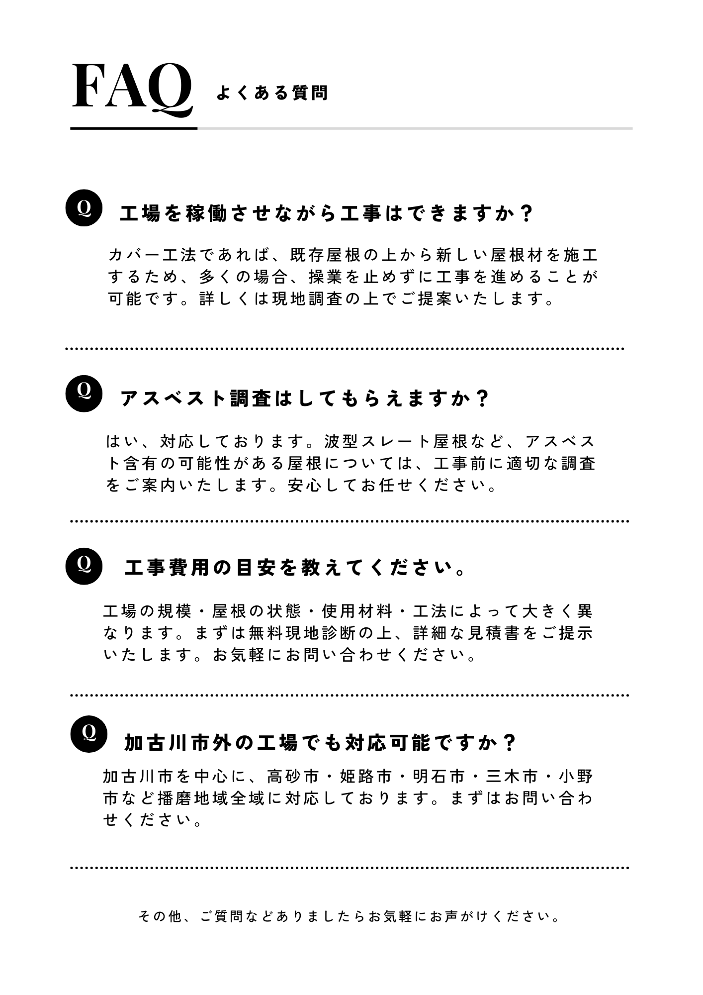 貴社の工場の屋根状態・ご予算・稼働スケジュールを総合的に判断し、最適な工法をご提案いたします。まずはお気軽にご相談ください。